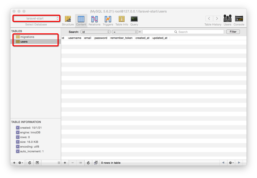 连接完数据库之后,还得创建一个Users表,你可以直接在数据库中创建Users表,也可以利用Laravel的artisan来创建,这里我们使用Laravel的artisan来建表,顺道了解一点点关于Laravel migrate的知识。执行下面语句: