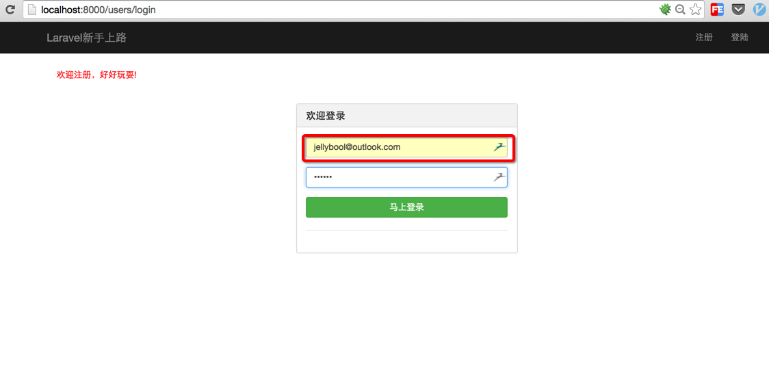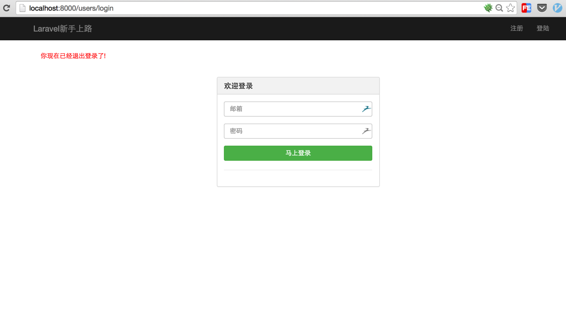 正常情况下,你注册完之后就吼跳到登录界面(已经写好了),但是我们在登录的时候也需要验证,如果你仔细看上面的login.blade.php的话,你会发现我们在这里将用户的登录表单提交地址设置为