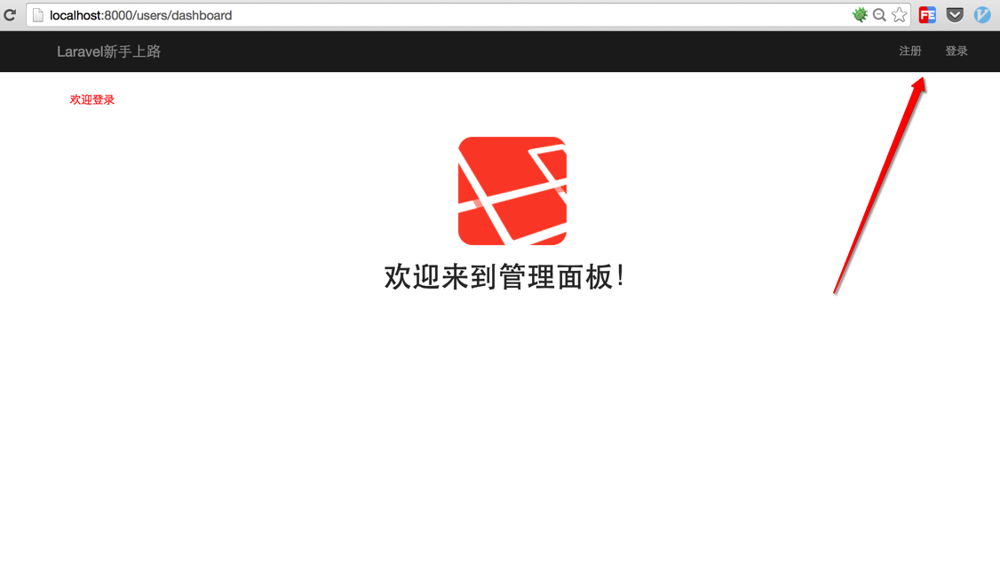 现在逻辑是不是很清晰,我们接下来的一步自然是创建dashboard.blade.php文件了,这个从getDashboard()看出我们依然是将这个视图文件存在views/users/目录下,我们就简单地在dashboard.blade.php写上几行入门级的HTML: