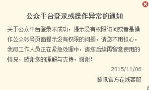 微信公众平台后台今天早上出现登录故障,多地网友和CB编辑报告了这一故障。登录时显示“系统错误,请稍后再试”。腾讯方面回应称正在处理中。昨天,微信全站封杀第三方表单服务麦客,当时腾讯回应已经处理好问题并解除封杀。目前尚不清楚是否两件事情之间有关联。
