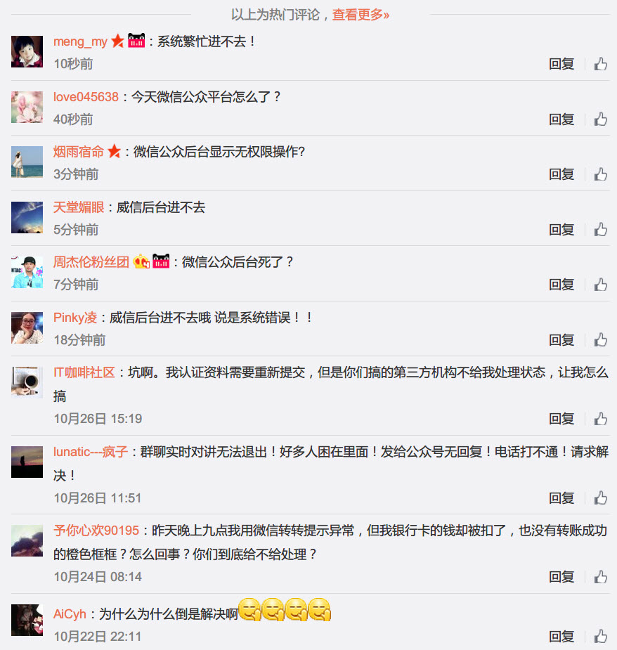 微信公众平台在新浪的官方微博很久没有更新,最新评论已经都是反应故障的: