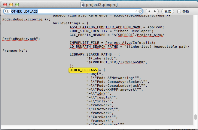 (2)用文本编辑器打开,然后查找OTHER_LDFLAGS